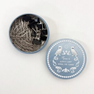 ブック型の缶は、ポストカードサイズの紙物に適しています。